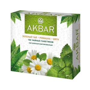 Каталог продукцииЧай Akbar Зеленый с натур.добавками ромашки и мяты 100 пак.*2 гр. с/я (6) ЖЦ |